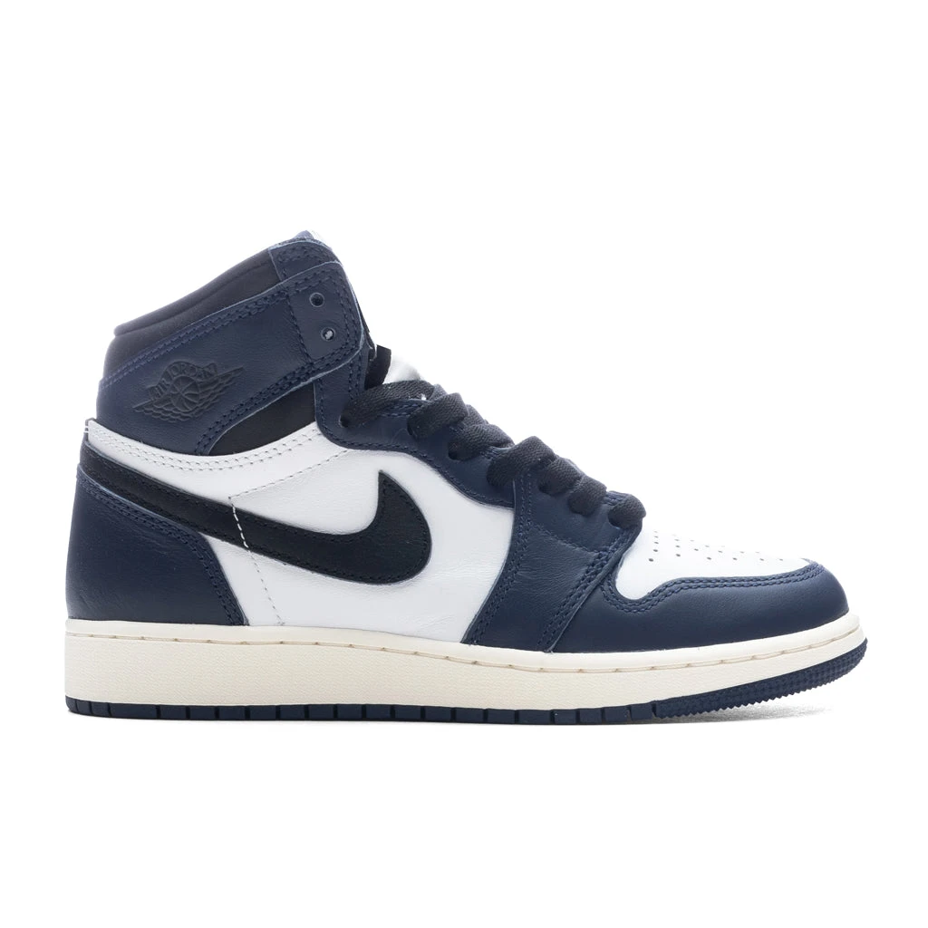 The Air Jordan 1 Retro High OG (GS) in Midnight Navy/Black/White is the latest addition to the Air Jordan lineup. Composed of an all-leather upper, the sneaker features a perforated toe box paired with a signature Swoosh and heel and collar overlays. Retro Wings branding is seen at the latter, aligning itself with the woven Nike Air tag residing at the breathable nylon tongue. The entire design sits upon a rubber cupsole, while the encapsulated Air-sole unit provides optimal cushioning and comfort with each step.