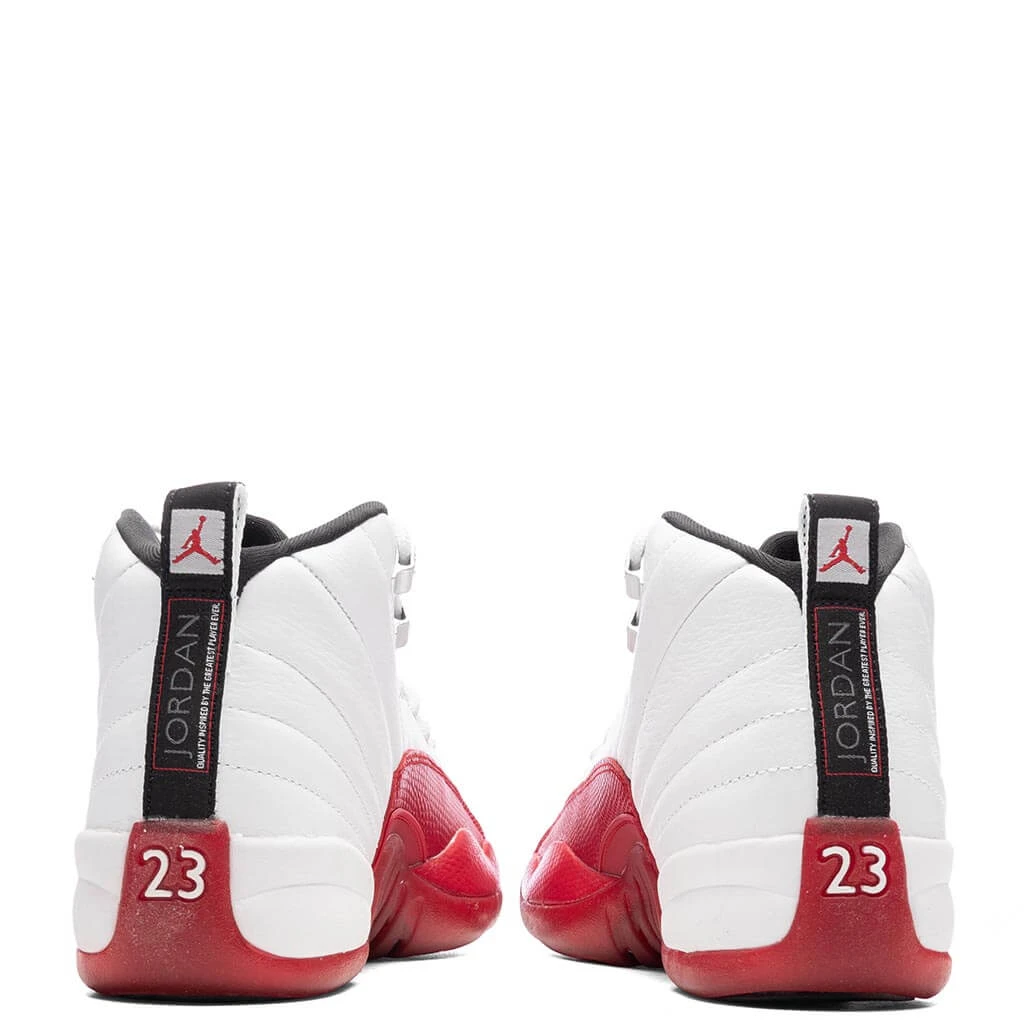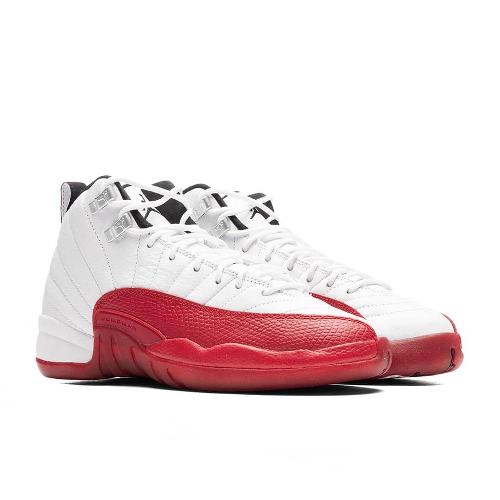 The Air Jordan 12 “Cherry” makes a triumphant return, featuring its iconic color blocking. White dominates the leather upper, with “Varsity Red” highlighting the textured mudguard. Black accents adorn the heel tab, lining, and the tongue’s Jumpman logo, while silver eye stays add a stylish touch. The outsole combines red, black, and white patterning, completing the classic look. Revisit this legendary design and elevate your sneaker game with the Air Jordan 12 “Cherry.”