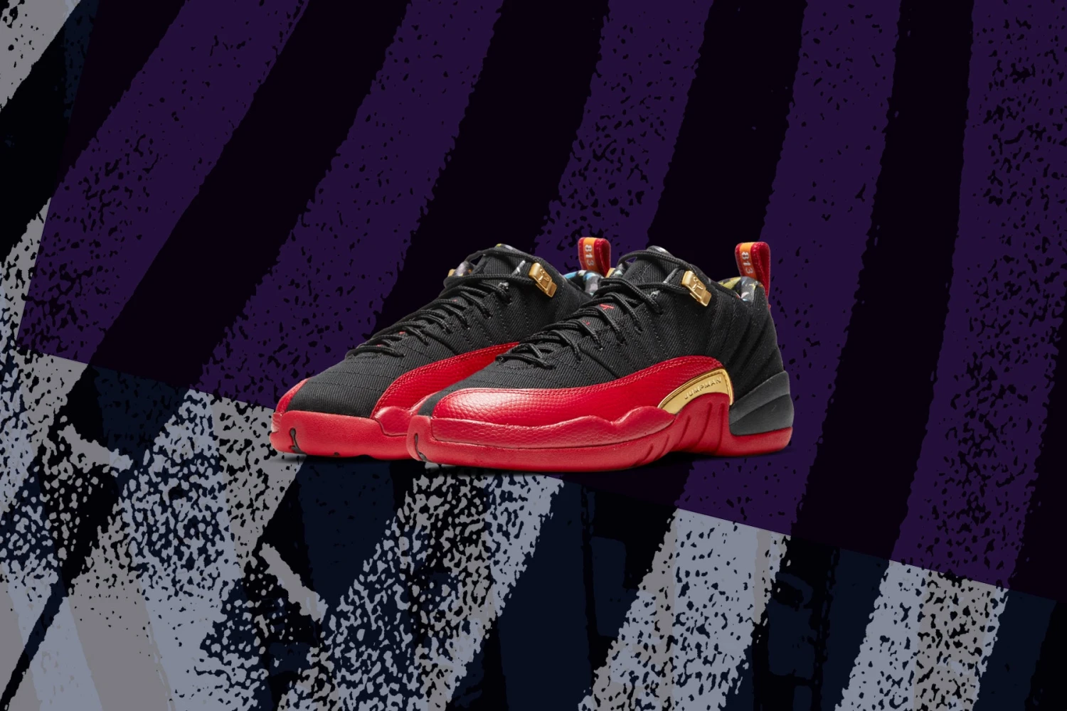 To celebrate the 2021 Super Bowl, Nike has put forth a new colorway for the Air Jordan 12 Retro Low SE model. Built with a canvas base, the sneaker is protected with a snake skin mud guard in the colorway Varsity Red. A confetti pattern fabric lines the inner sock and a pull-tab champions Tampa Bays area code ‘813’ in reference to the Super Bowl festivities. Intricate gold metal fixings accent the sneaker while a rubber sole with Air technology provide a comfortable experience.
