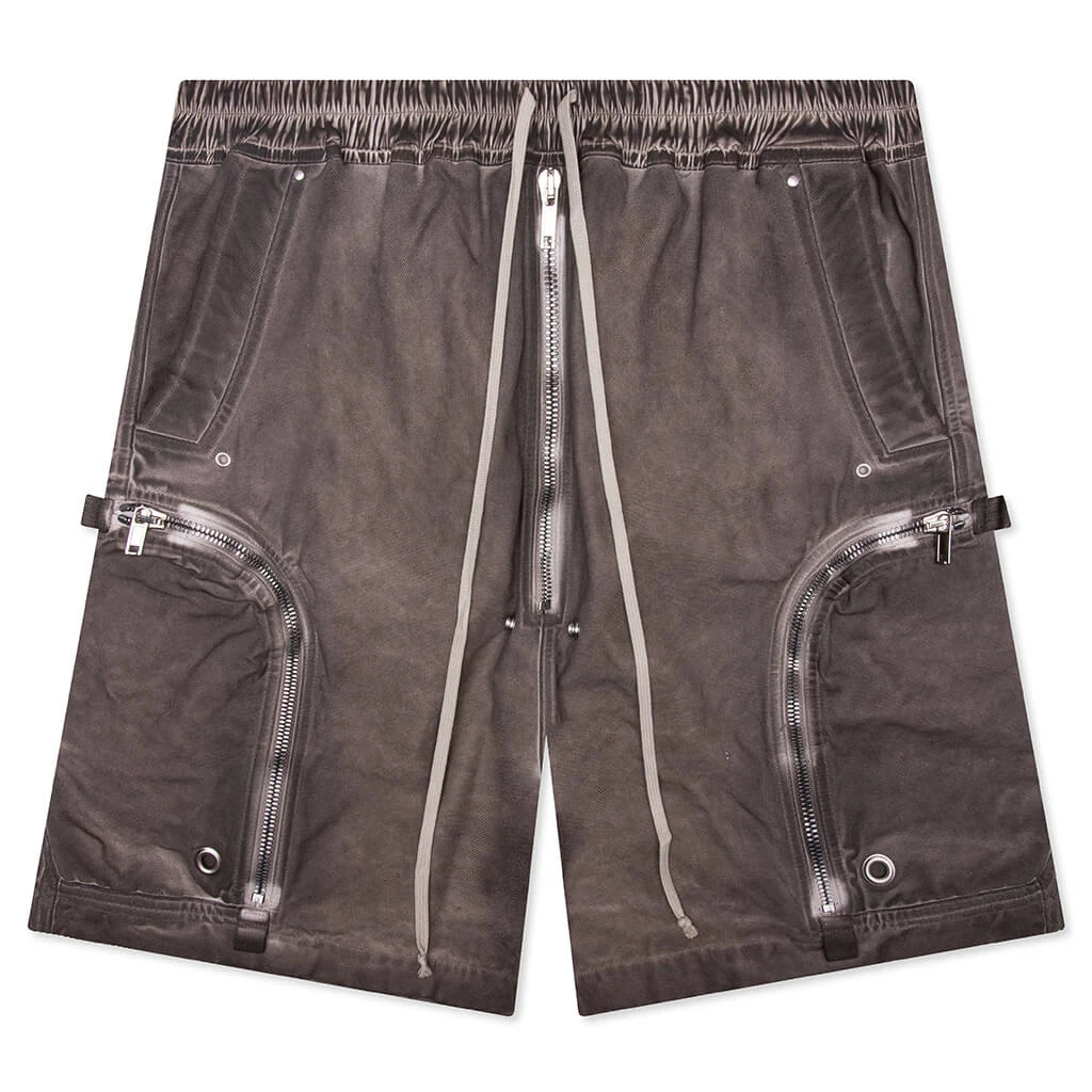 From Rick Owens’ SS25 “Hollywood” collection, the Bauhaus Shorts are cut from lightweight Tencel ripstop with a soft, technical hand feel and a water-repellent finish. They feature a low dropped crotch and knee-length fit with an elastic waistband and drawstring closure. Signature rounded Bauhaus zip pockets sit at the thigh, detailed with webbing and eyelets. Finished with side pockets and snap flap pockets at the back.