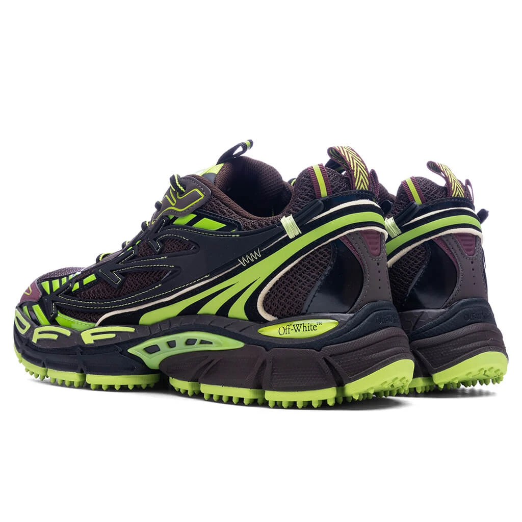 The Be Right Back Sneaker in Brown/Green combines mesh, faux leather, and textile materials for a layered upper, paired with a durable rubber sole. Key details include a lace-up front, a rubberized OFF-WHITE logo on the padded tongue, and signature arrow motifs along the side panels. Dual pull-tabs and a detachable zip tie at the laces add functional and iconic design elements, while the padded low-cut collar ensures all-day comfort.
