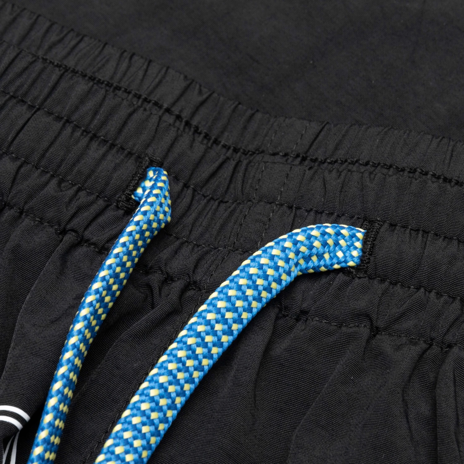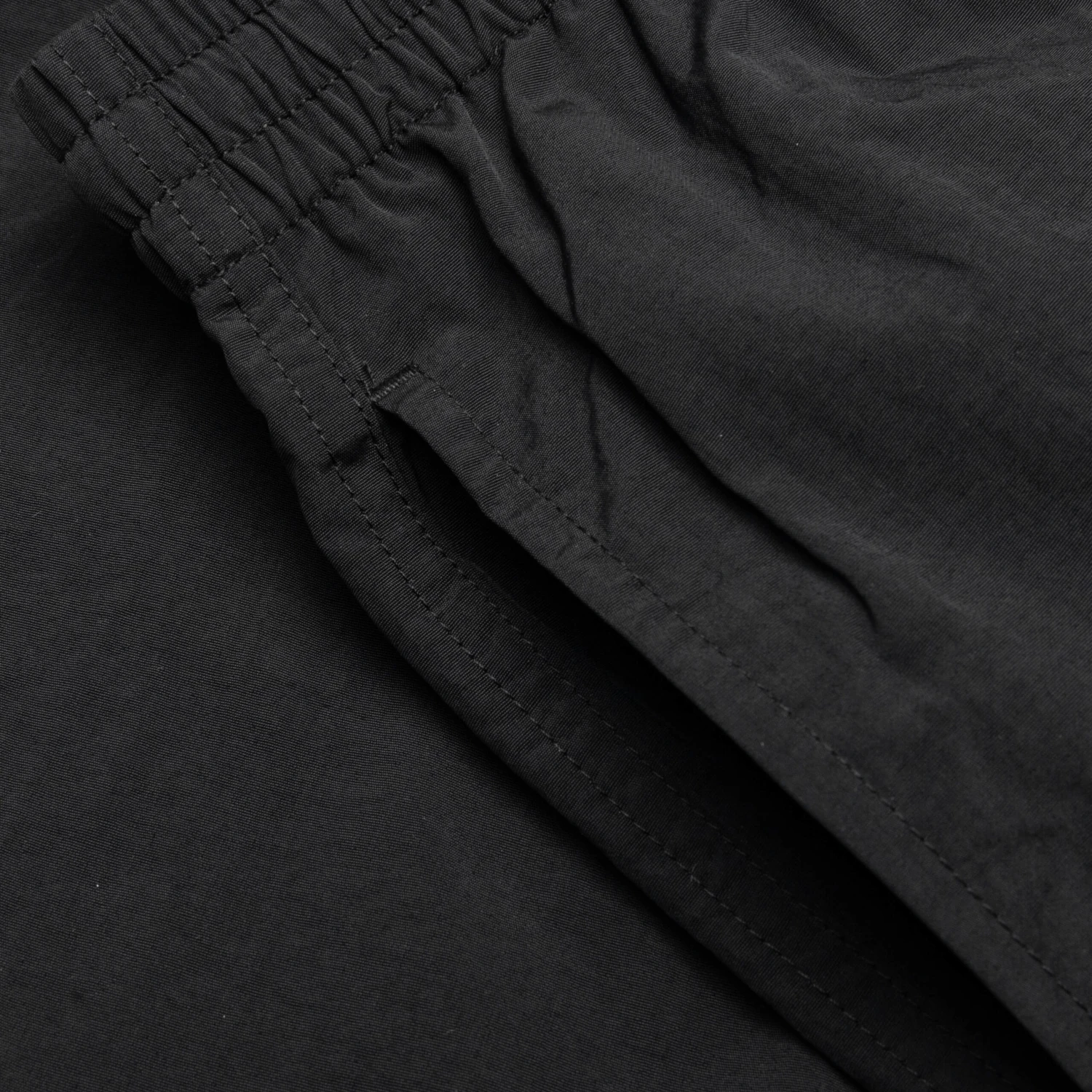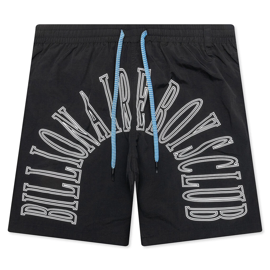 The Sunrise Shorts in Black are made from pure nylon. They feature an elastic waistband with a drawstring for an adjustable fit and screen-printed branding. Perfect for a comfortable and stylish look.
