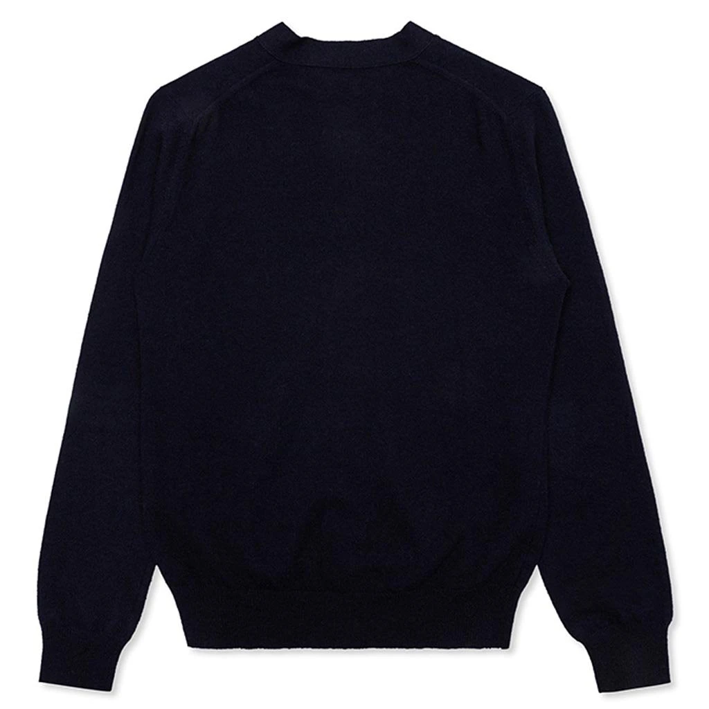 The concept of the Comme des Garcons PLAY line is design by not designing. Characterized by the iconic red heart logo designed by artist Filip Pagowski, the line is a collection of unisex basics, fragrances, and footwear for those who enjoy simplicity. Pictured is the Comme des Garcons PLAY Knit Cardigan Red Heart in Navy. AZ N008 051 2