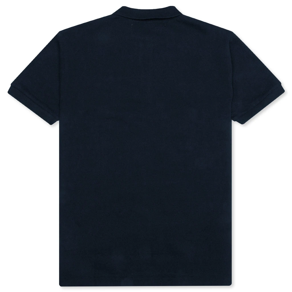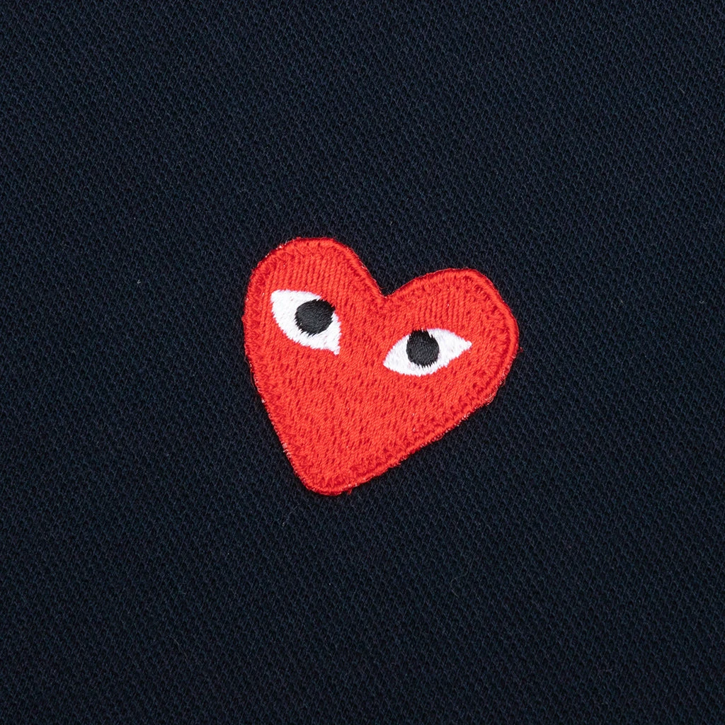 The concept of the Comme des Garcons PLAY line is design by not designing. Characterized by the iconic red heart logo designed by artist Filip Pagowski, the line is a collection of unisex basics, fragrances, and footwear for those who enjoy simplicity. Pictured is the Comme des Garcons PLAY Women’s Red Emblem Polo Tee in Navy. AZ T005 051 2