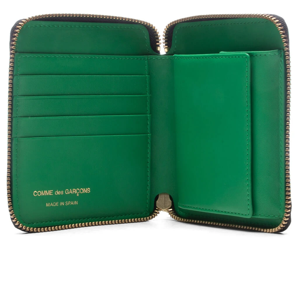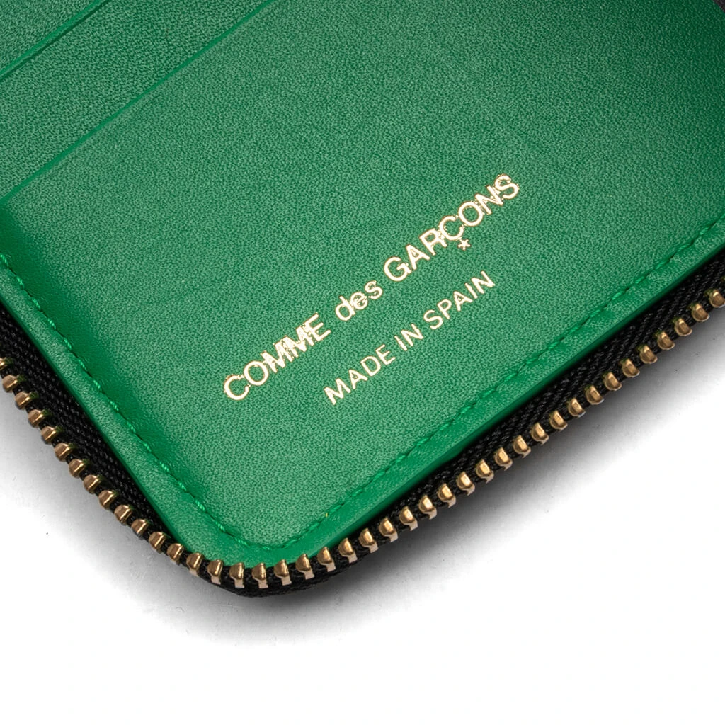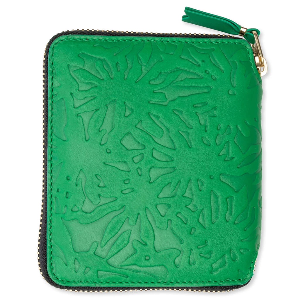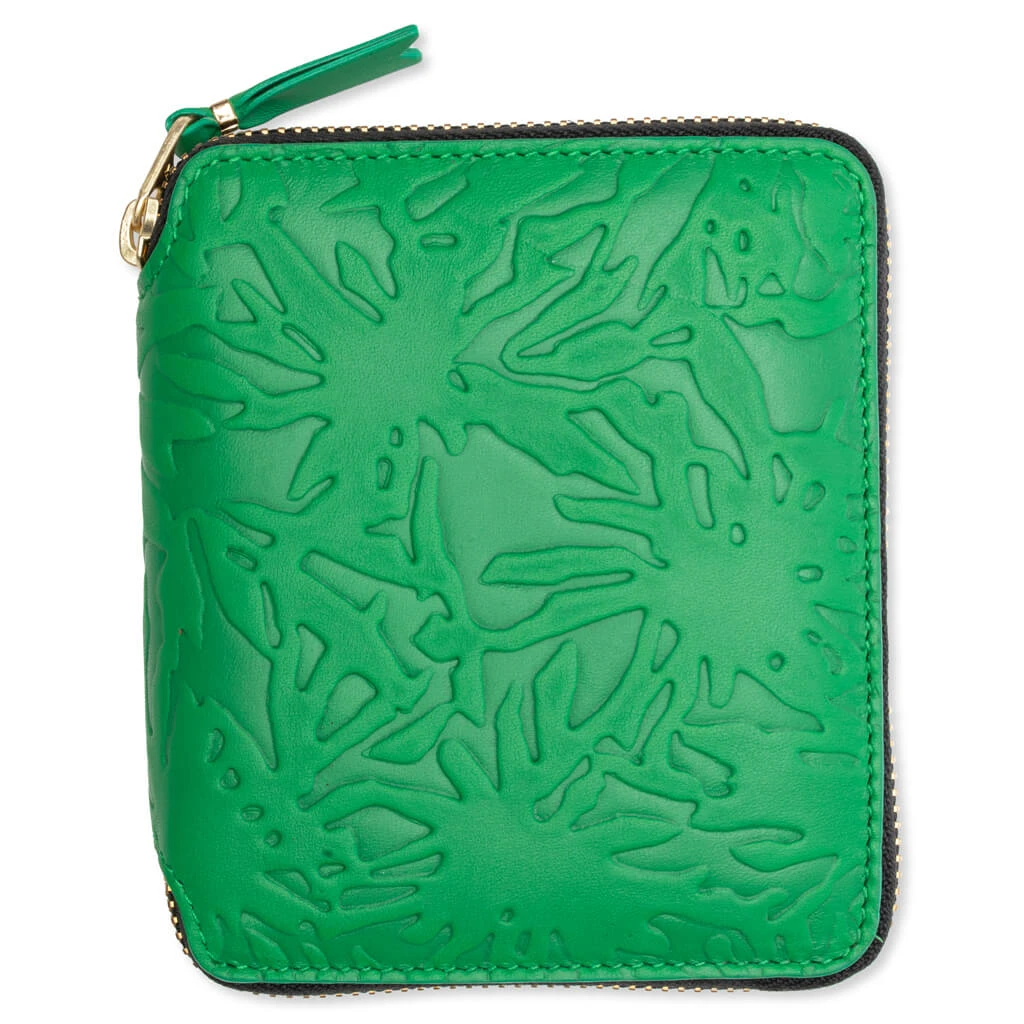 Upgrade your accessory collection with the Comme des Garcons Embossed Forest. Featuring a cowhide leather construction, the wallet features tonal stitching along with a gold zipper and zip pull. The large main compartment includes four card slots and a coin pouch. The button closure finishes the design.