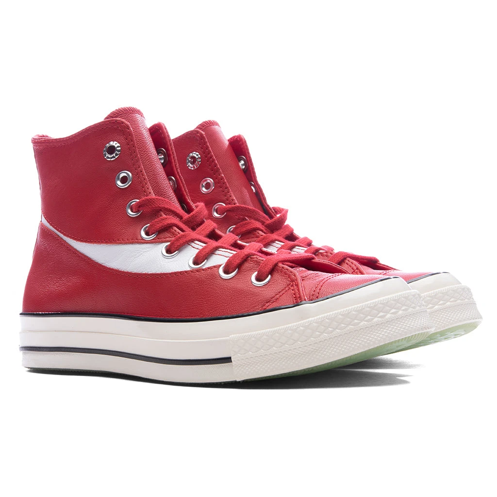 Converse and Coca-Cola come together to create their own iteration on the Chuck 70 Hi. Built with a leather upper for durability, the shoe features its timeless lace closure and OrthoLite cushioning for comfort. A egret midsole and red toe cap deliver a polished look, while the signature leather ankle patch and classic All Star license plate highlights classicality. Coca-Cola branding appears with its signature Dynamic Ribbon placed on the upper and on the left license plate, representing elegance and history that both brands have.