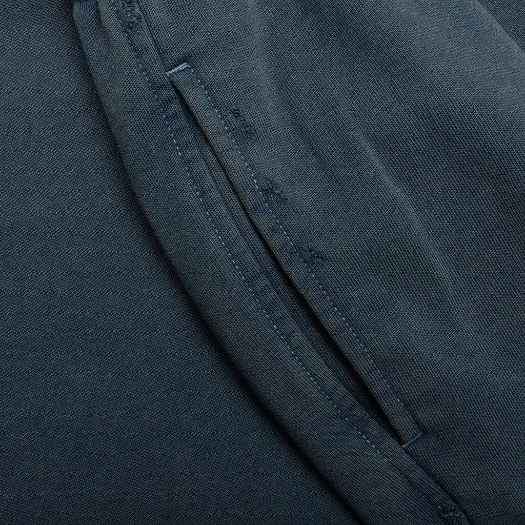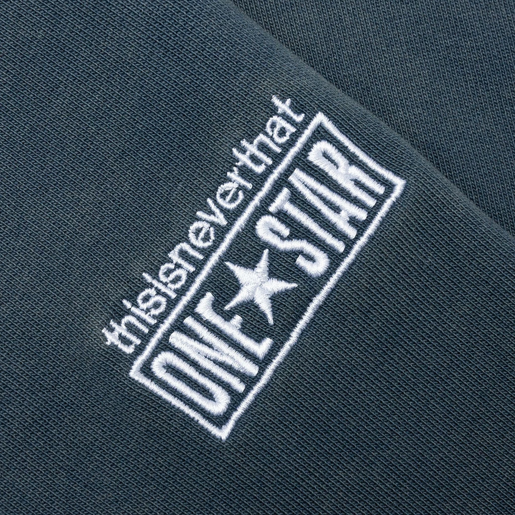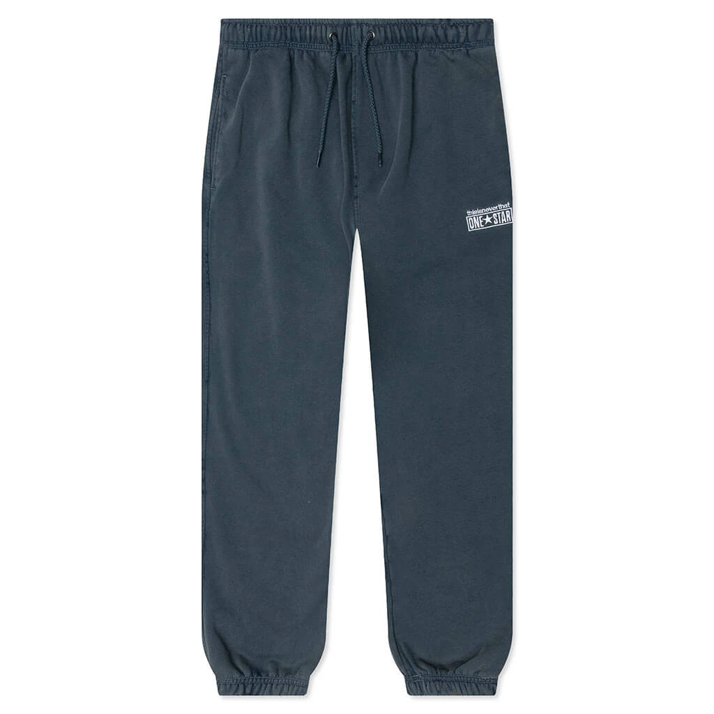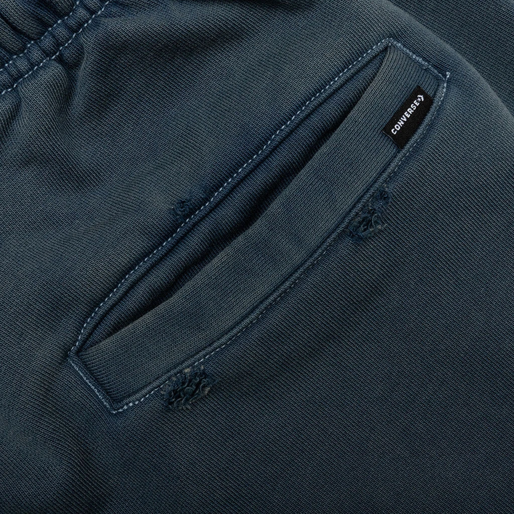 The Converse x This is Never That Gold Standard Pants in Majolica Blue deliver a relaxed yet refined aesthetic. Crafted from a durable cotton-polyester blend, the pants feature a washed effect and distressed details that create a vintage-inspired, worn-in look. An elasticated drawstring waistband ensures a comfortable fit, while elasticated cuffs add structure. Functional design elements include two side pockets and a back pocket for storage, complemented by an embroidered logo for subtle branding.