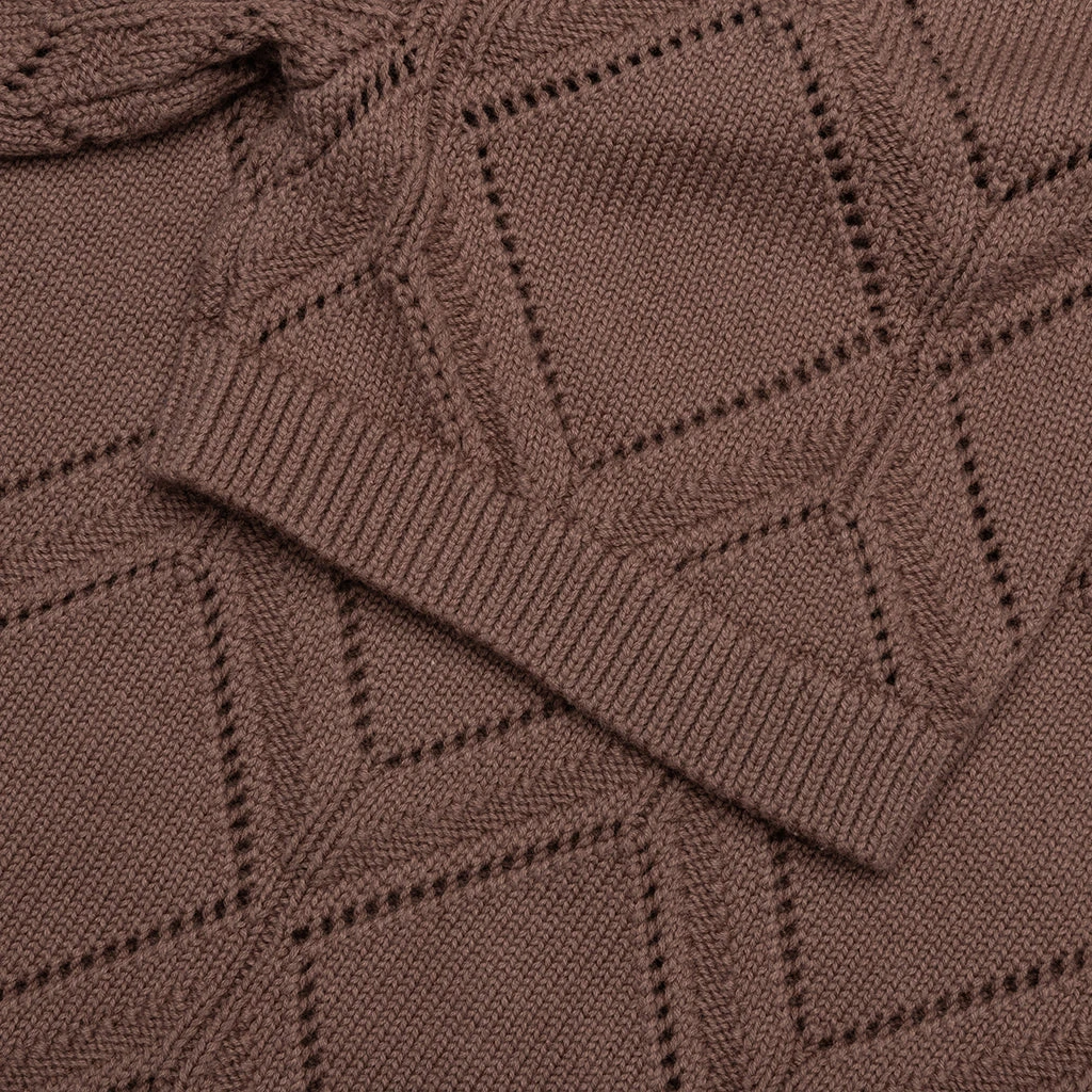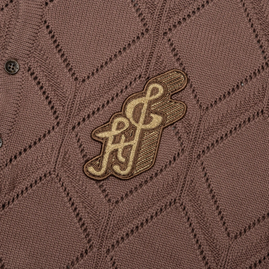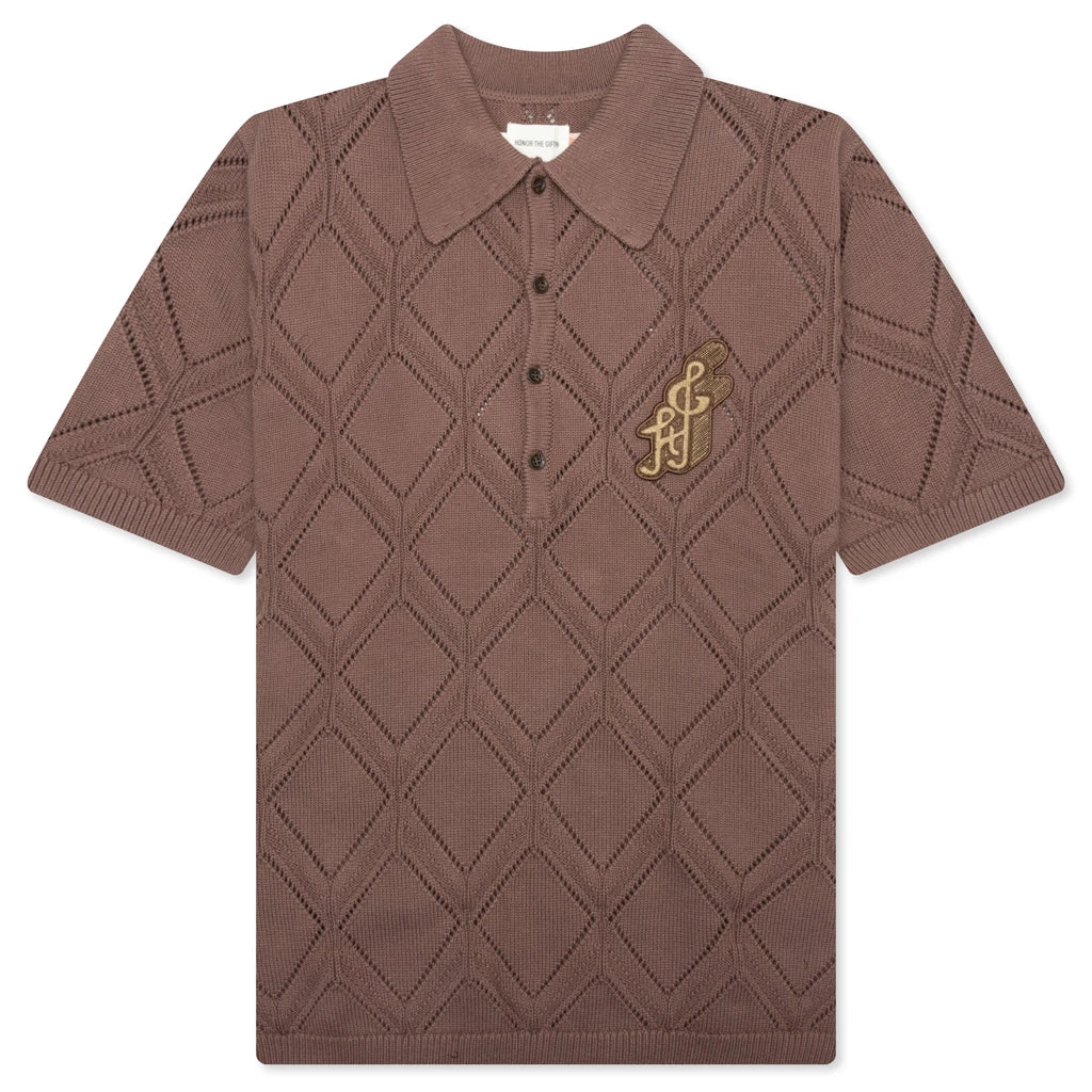 The Diamond Knit Polo in Brown features a diamond pattern jacquard knit design, offering a textured look with ribbed cuffs and waist for a clean fit. A chenille music note patch adds a playful detail, while the classic polo collar completes the refined yet relaxed style.