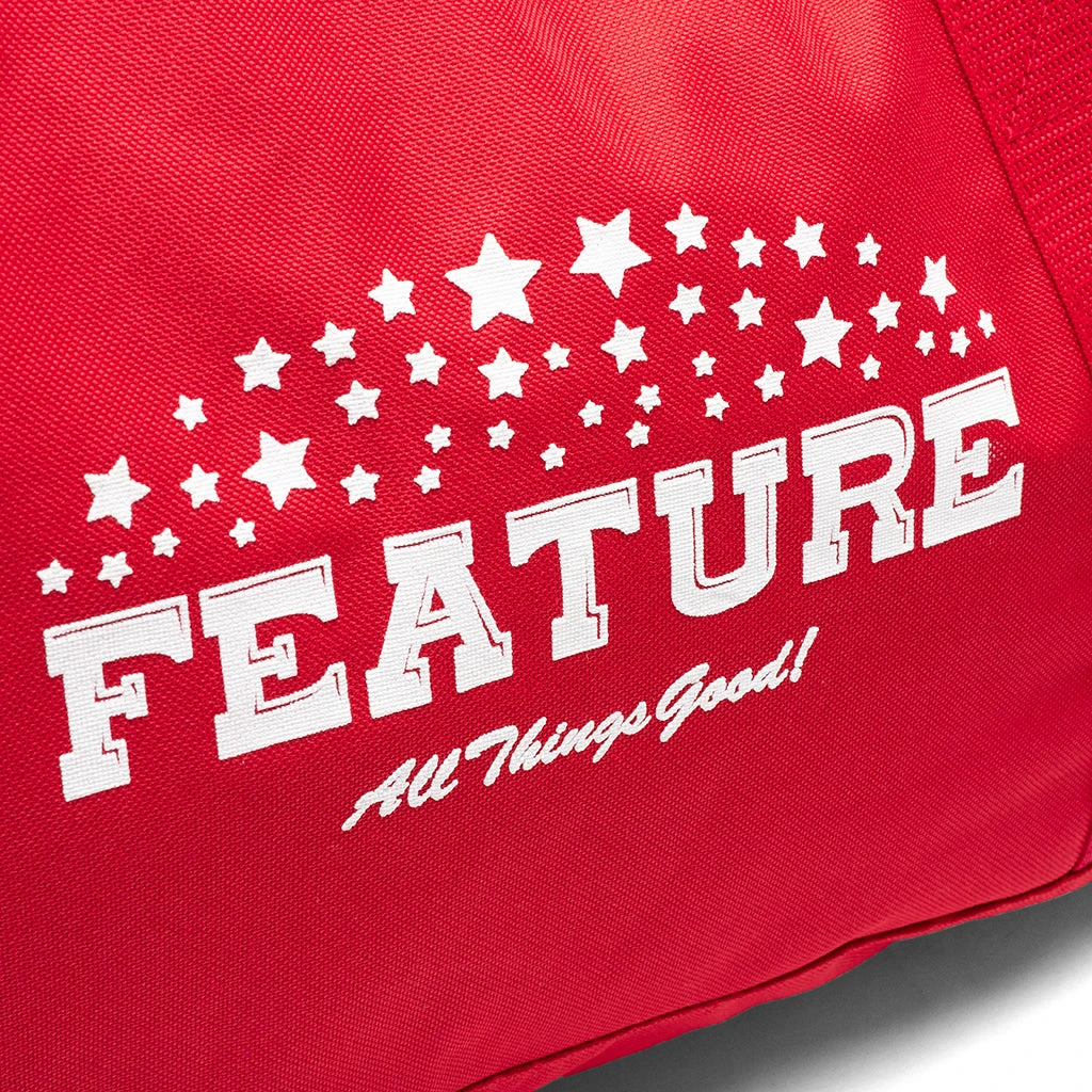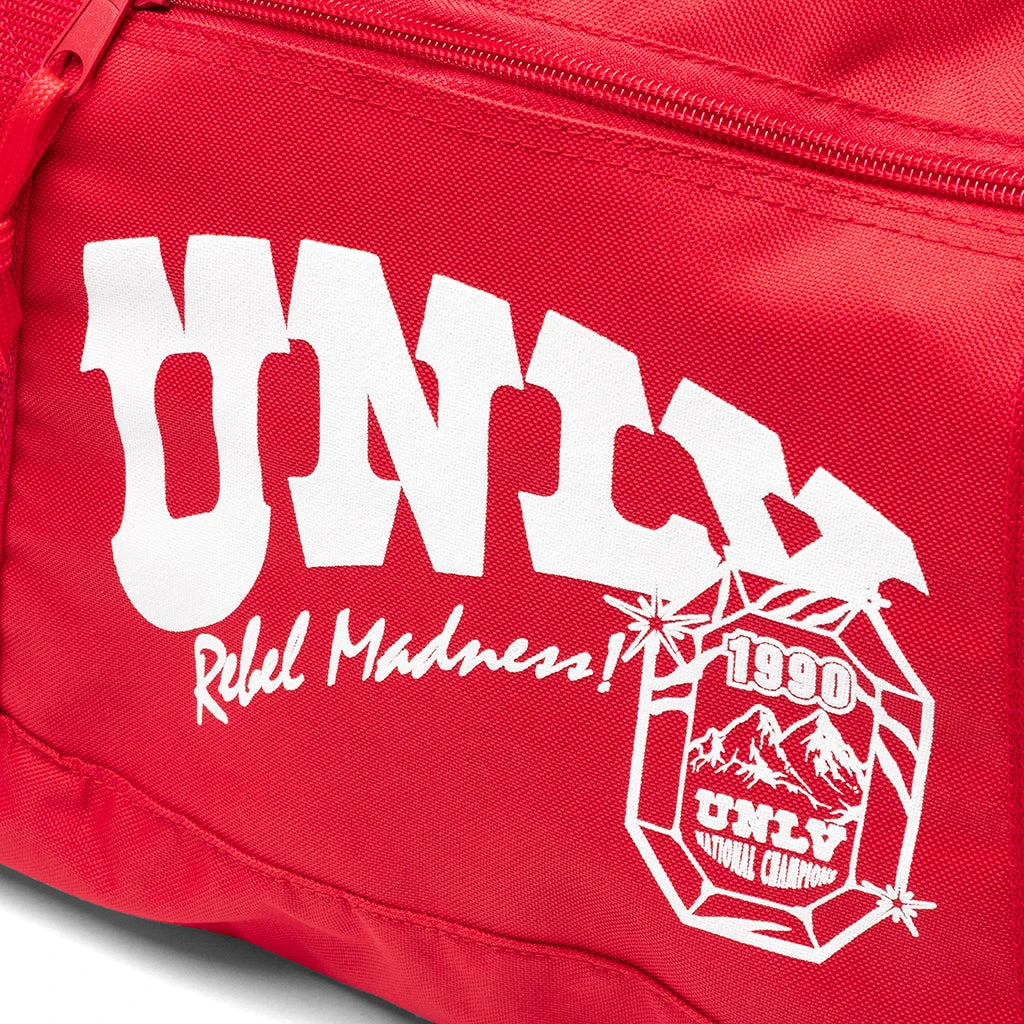 Our Feature x UNLV University Duffle Bag features the UNLV logo and screen-printed graphics on a standard sports bag. Pictured is the Feature x UNLV University Duffle.