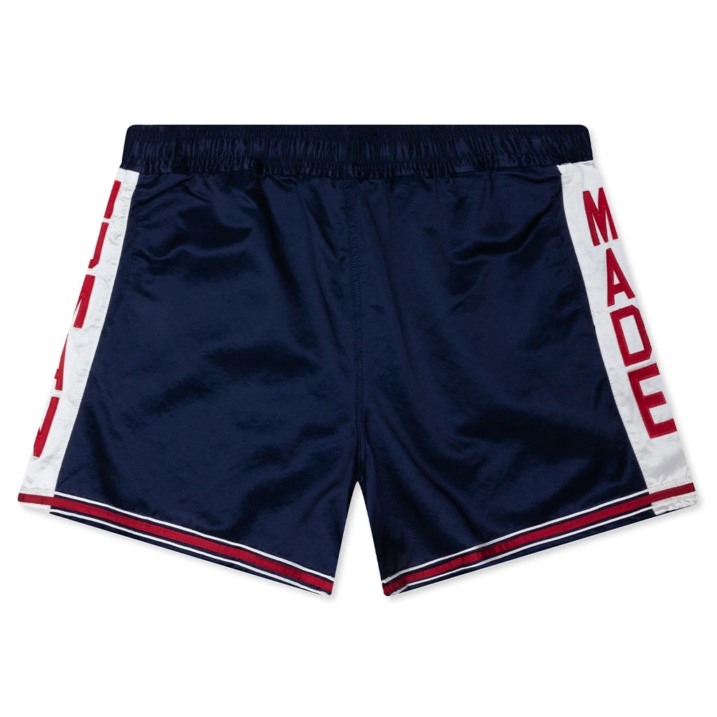 The Human Made Gym Shorts draws inspiration from athletic roots. Constructed from a smooth cotton-rayon satin, they feature bold logo graphics on the sides, contrast stripe detailing, and a relaxed fit that hits mid-thigh. Finished with an elastic waistband with custom branded drawstrings, side-seam pockets, and a rear pocket.