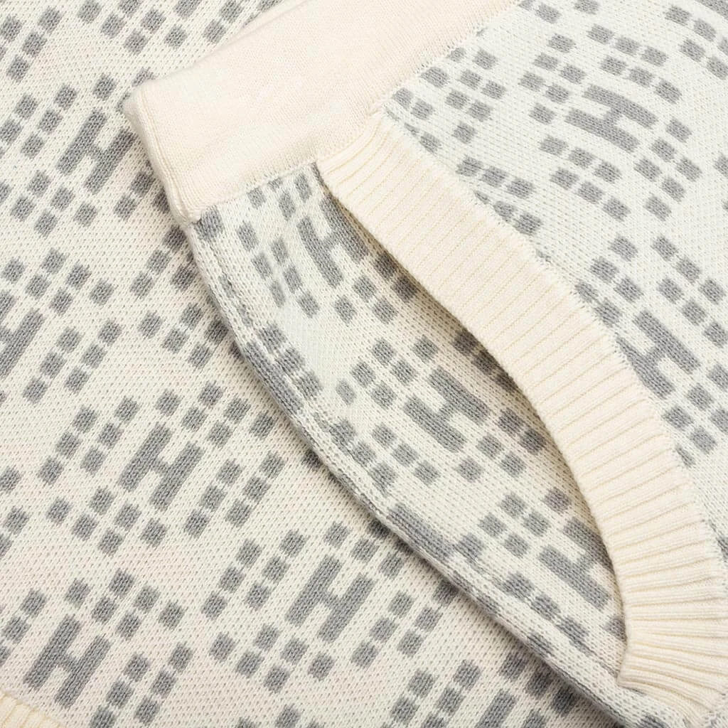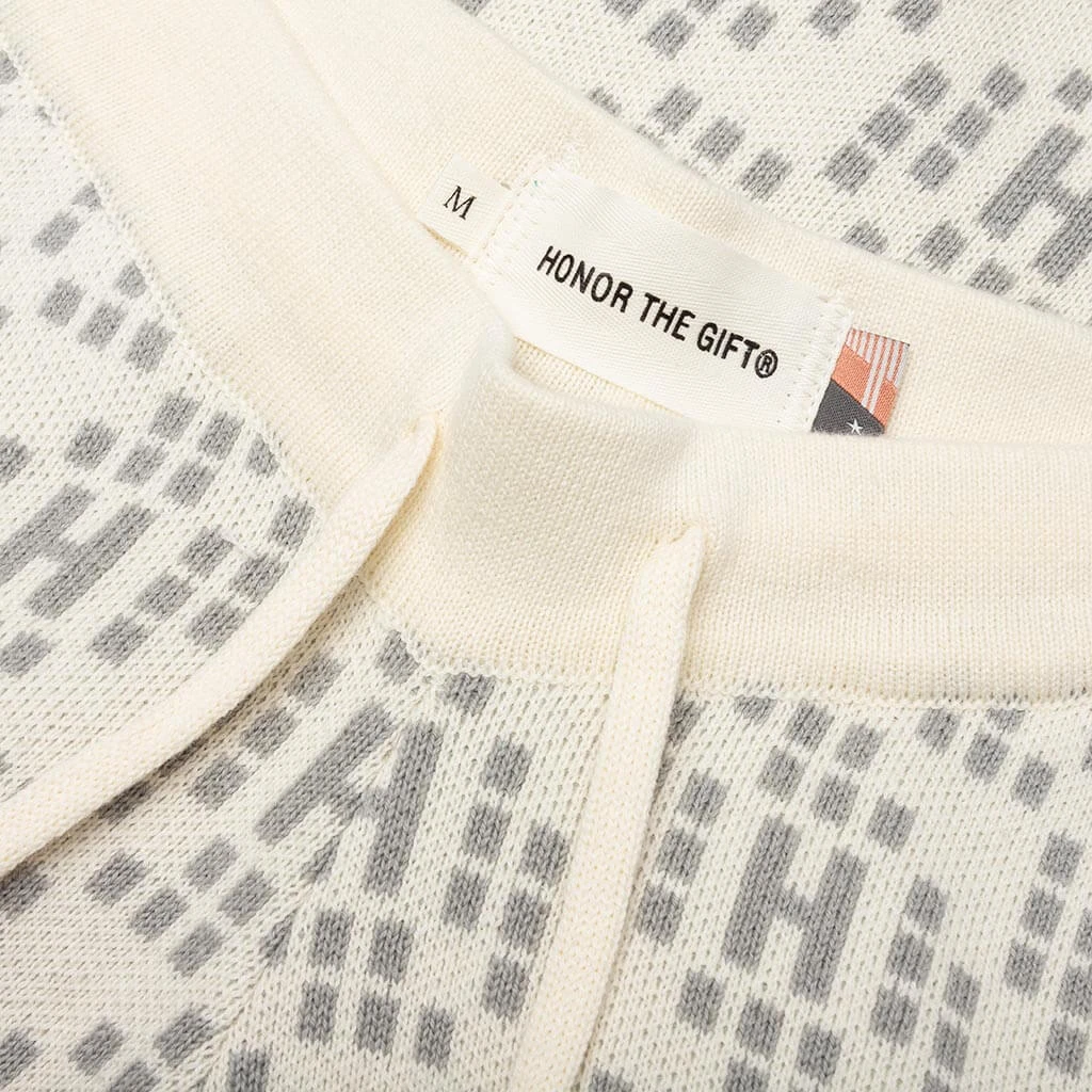 The Honor The Gift H Knit Short in Bone is crafted from 100% cotton, showcasing a fully knitted pattern for a distinctive texture. These shorts are designed for comfort, featuring an elastic waistband with a drawstring for an adjustable fit and ample storage with side and back pockets. Ribbed trims complete the look, making these shorts both functional and stylish.