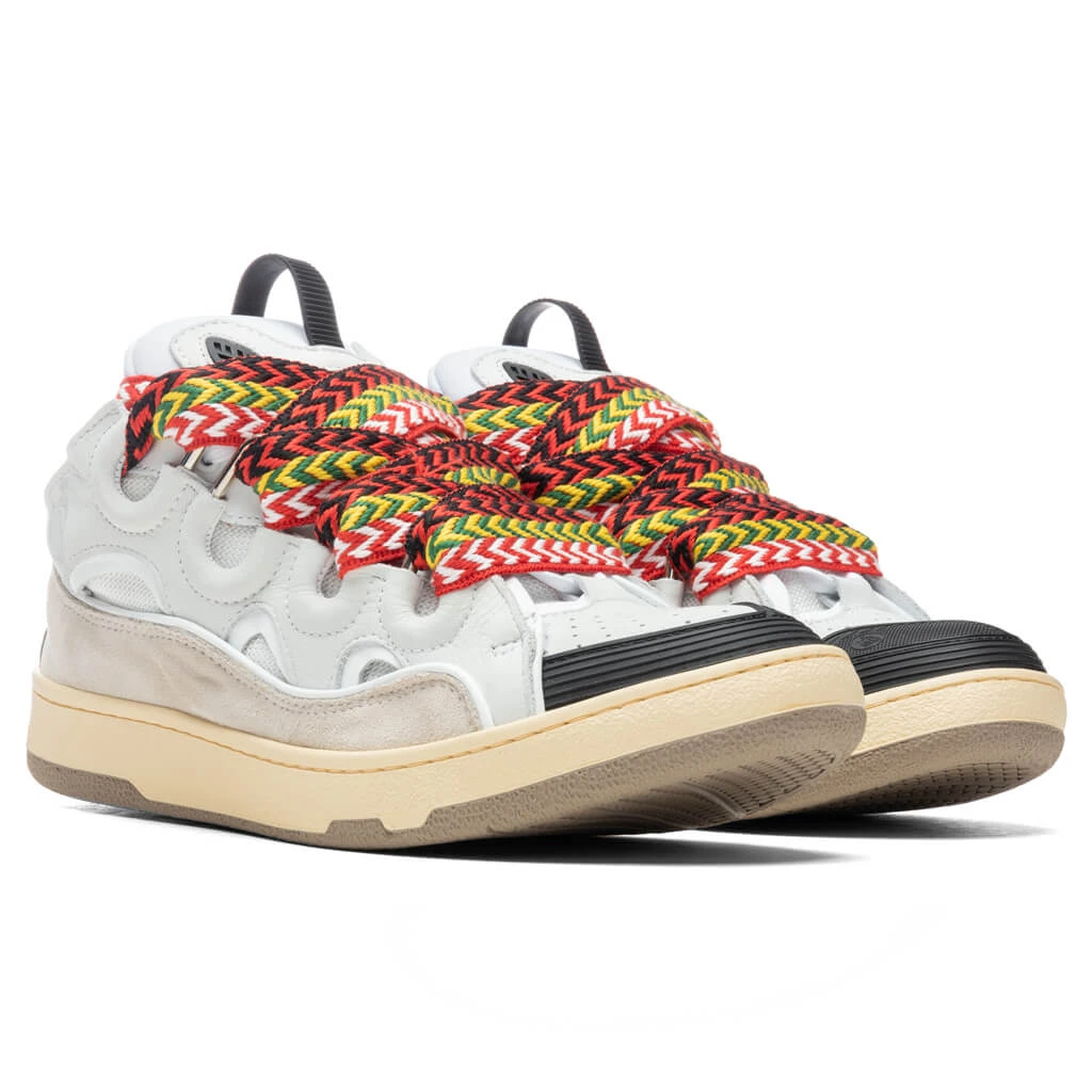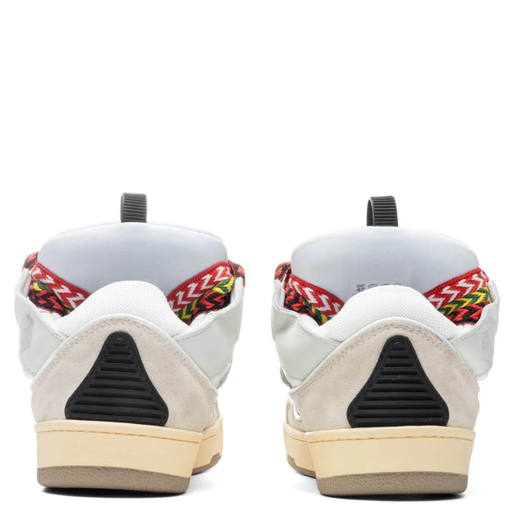 Bruno Sialelli of Lanvin unveils the latest Curb Sneaker rendition. The low-top sneakers feature a blend of Nappa calfskin leather, suede, and mesh within the upper. The sneakers feature exaggerated dimensions due to their rounded shape, padded tongue, and curved metallic eyelets. A loop tab at the tongue and the perforated toe box add a functional touch, while the double waxed herringbone laces add further spotlighting. The embossed quilted tongue and rubber outsole underneath ties together the rest of the sneaker.