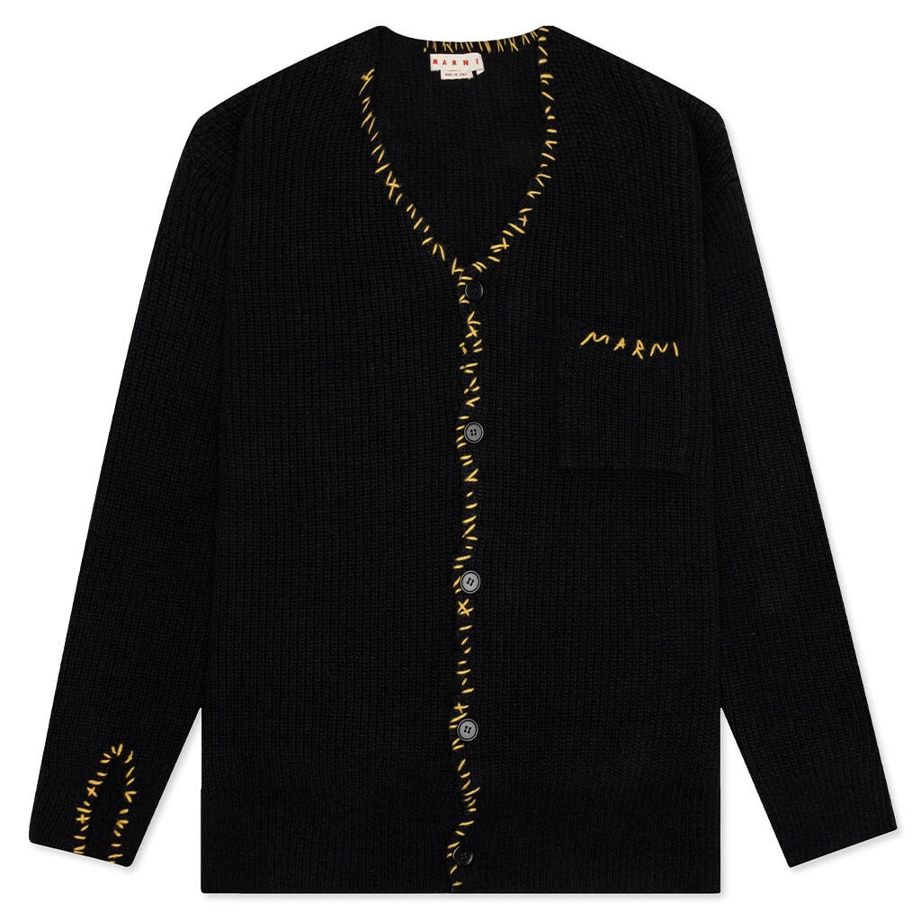 The Marni Black Wool Cardigan with Raw-Edge Detailing makes an impression on any apparel rotation. Cut from wool, the design includes a v-neck paired with raw-edged hem and buttoning. Embroidered branding is seen at the left chest pocket for a finished look.