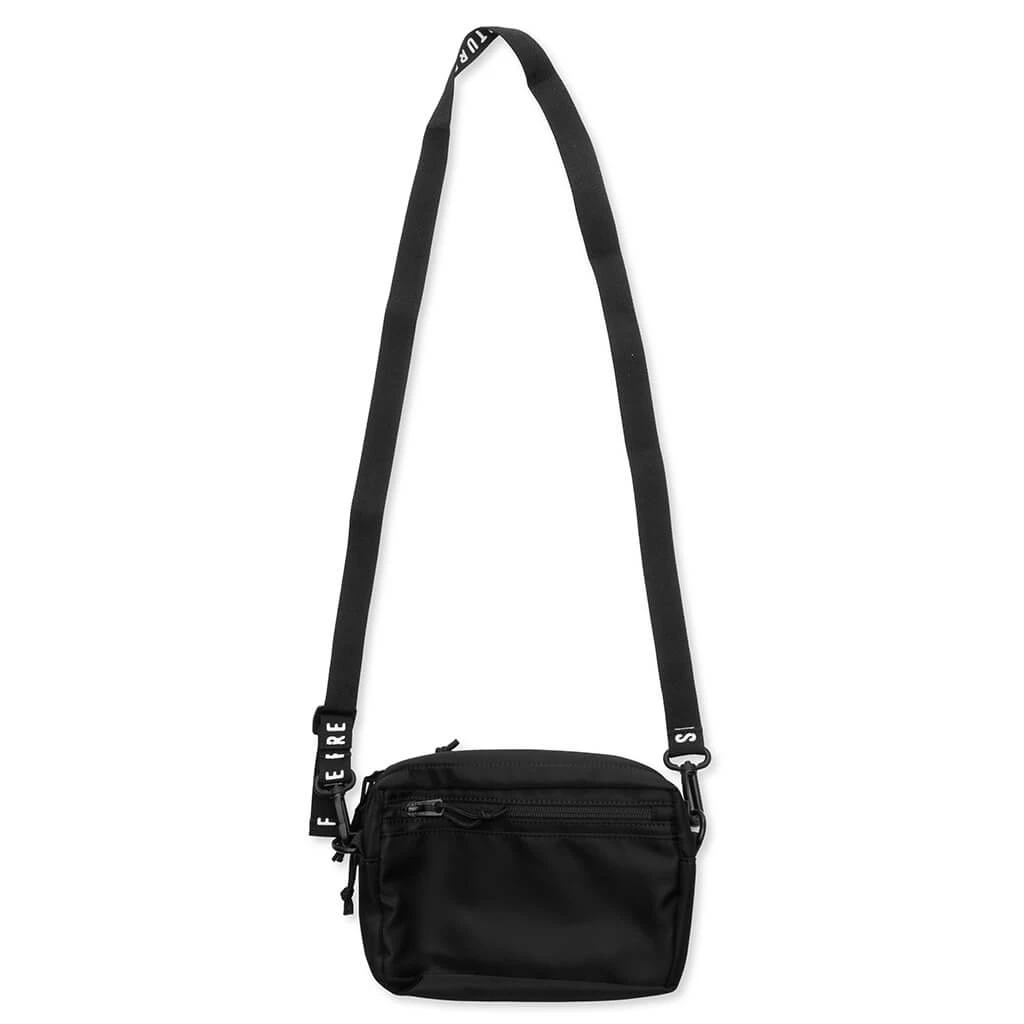 The Military Pouch Small in Black features printed branding on the front with a secure magic tape closure. It includes three zipper compartments for easy organization and an inner pocket in the main compartment for added storage. The adjustable and detachable shoulder strap, adorned with a printed logo, enhances versatility and style.