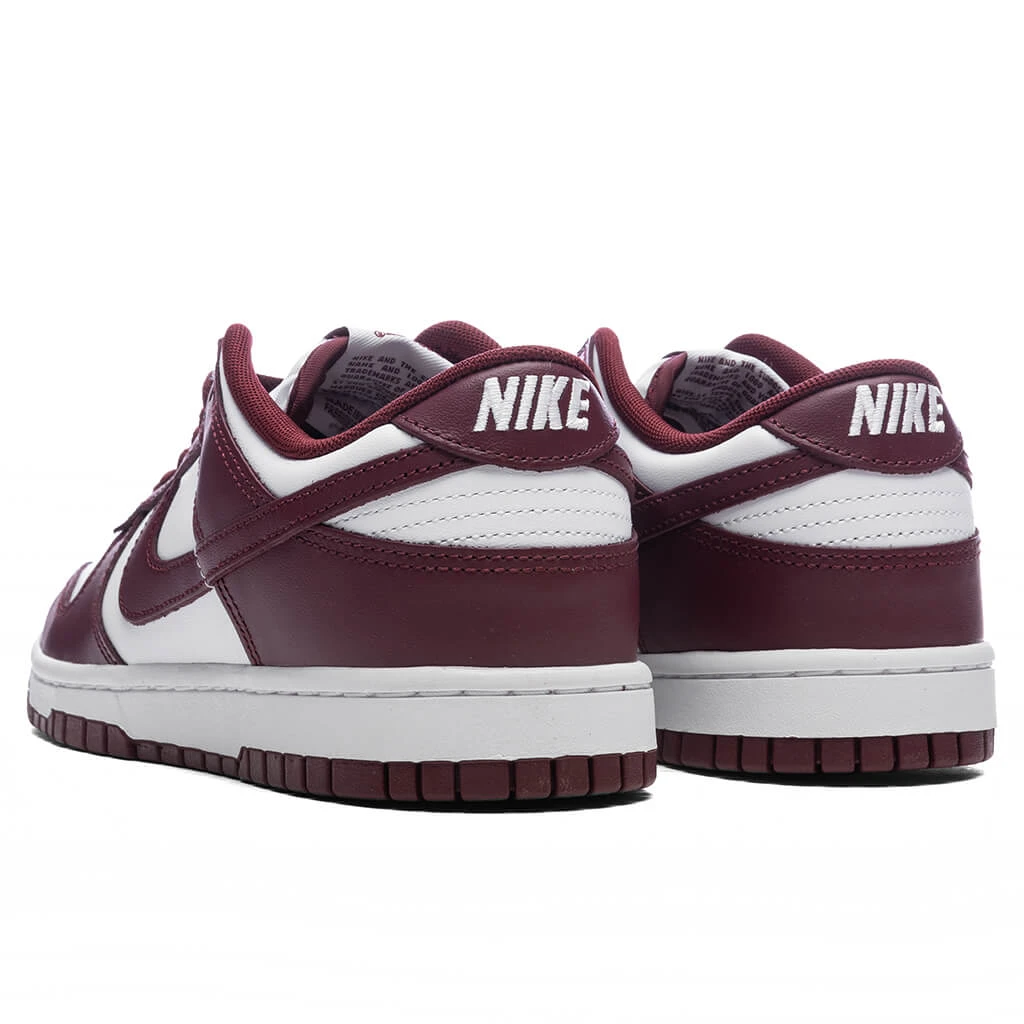 The Dunk Low Retro in White/Redwood/Gym Red features a leather upper with matching leather overlays. It includes a nylon tongue with a label, padded collar for comfort, and a perforated toe box for breathability. Embroidered branding and a durable rubber outsole complete the design.