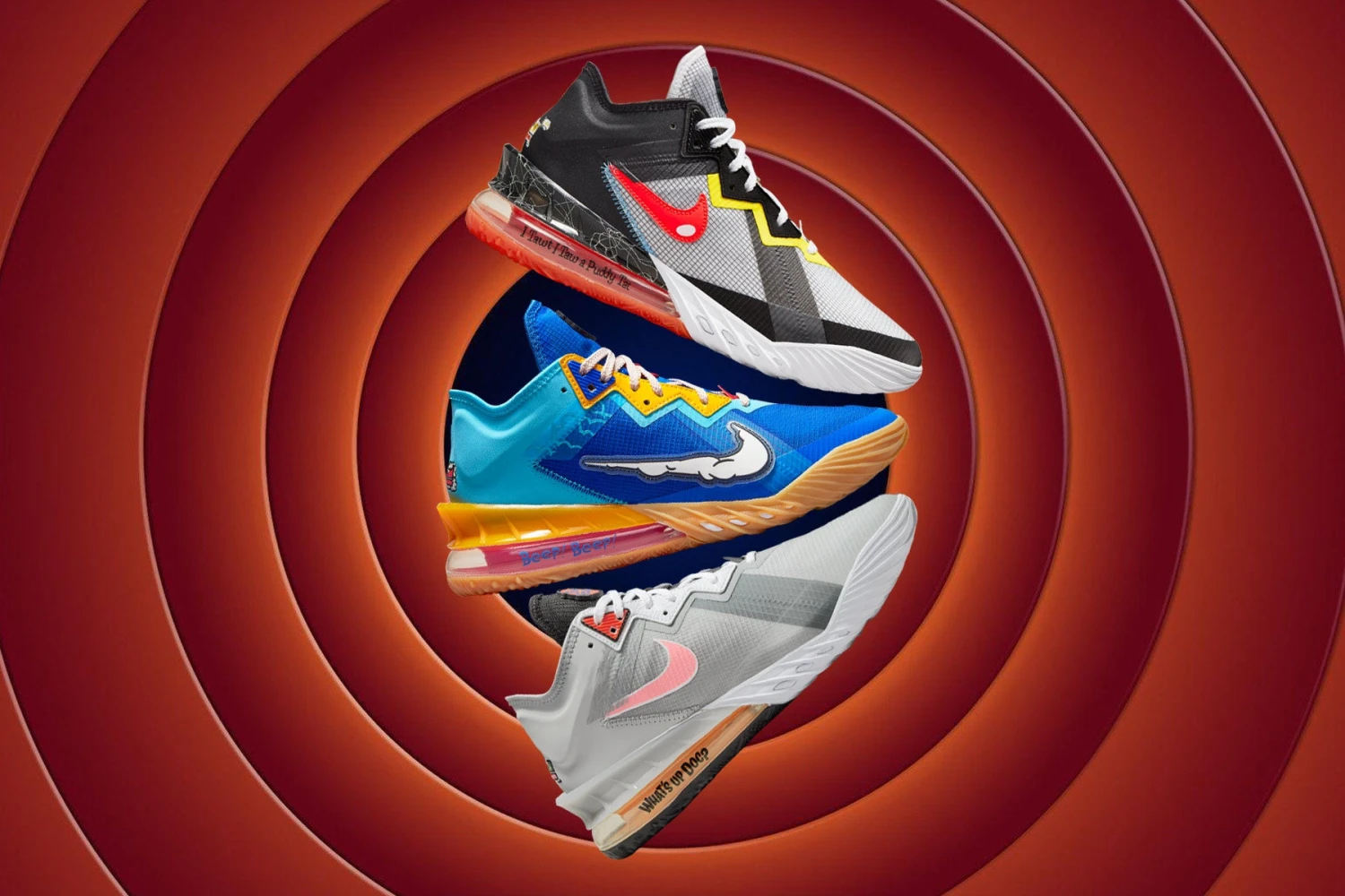 The most recent version of the Lebron XVIII Low focuses on top rivalries within the Looney Tune’s realm as seen with the Bugs versus Marvin theme throughout. Two different colorways decorate each sneaker for a bold look while reflecting the hues of Bugs Bunny and Marvin the Martian. Rubber and mesh textiles construct the upper while an Air sole unit is placed at the heel for a responsive experience with each step. A thin tongue elevates comfort and features a Tune Squad emblem at the front for an authentic finish.
