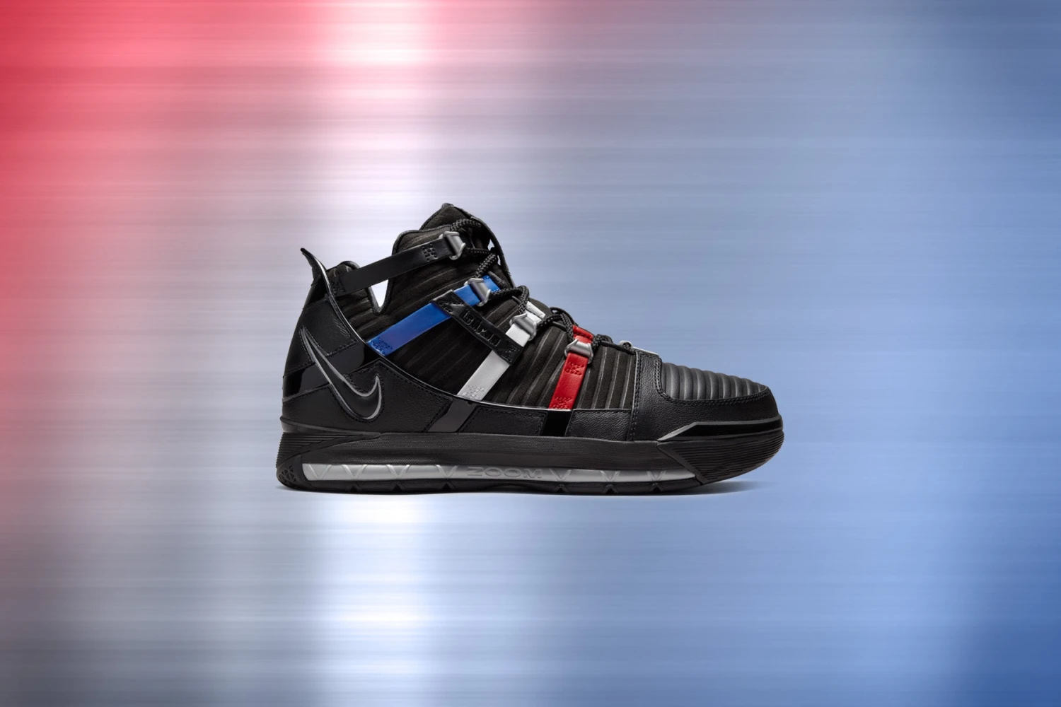 Lebron James’ family and hometown inspired the latest Nike Zoom LeBron 3. Featuring a premium blend of patent leather and nubuck within the upper, the sneaker features an array of striped textures from the toe box to the ankle collar. The fuzzy tongue makes an appearance from under the roped laces that are fastened with metal eyelets. The red, white, and blue stripes are inspired by barbershops’ signature poles. The outer heel is treated with a tilted-up Swoosh while the inner toe is embroidered with ‘BBZ,’ referencing his three children. A rubber outsole underneath finishes the look.