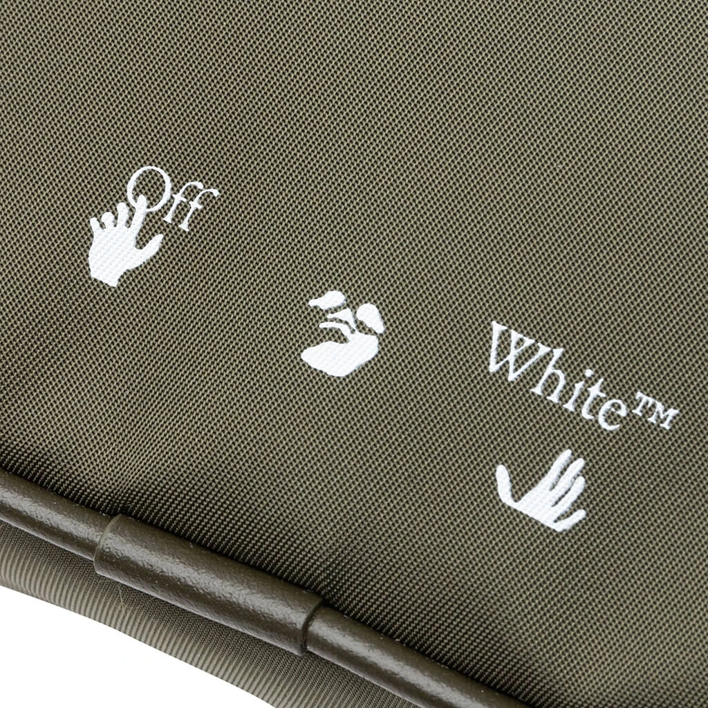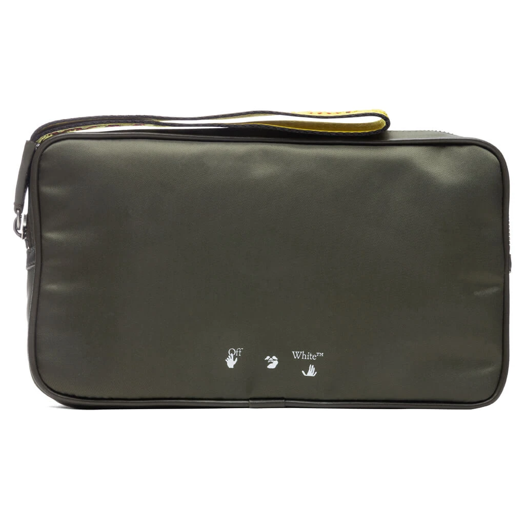 The versatile design of the OW Logo Nylon Pouch Bag is the latest installment from Virgil Abloh’s Off-White. Tactical styles are emphasized as the iconic construction belt perfectly pairs with the nylon green bag. Metal zippers and printed branding complete its classic design.