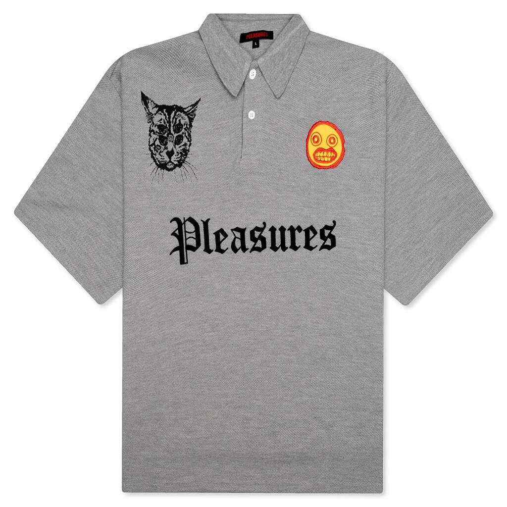The Wyatt Boxy Polo is crafted from a quality mix of 65% polyester and 35% cotton, this boxy polo shirt features an array of mixed print, embroidery, and patch artwork throughout, making it a true statement piece. The grey shirt has a slightly cropped silhouette, with generous room in the sleeves for added comfort. While it fits true to size, it provides an oversized look.