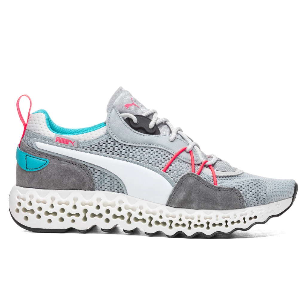 PUMA executes their latest development in footwear technology – the Calibrate Restored Tron sneaker features XETIC tech elevating the sole’s cushion by rebounding applied forces. The upper is composed of breathable mesh with varying overlays including suede and leather. A full lace enclosure is secured with blue wires while a stitched pull-tab is added on the heel for easy application.