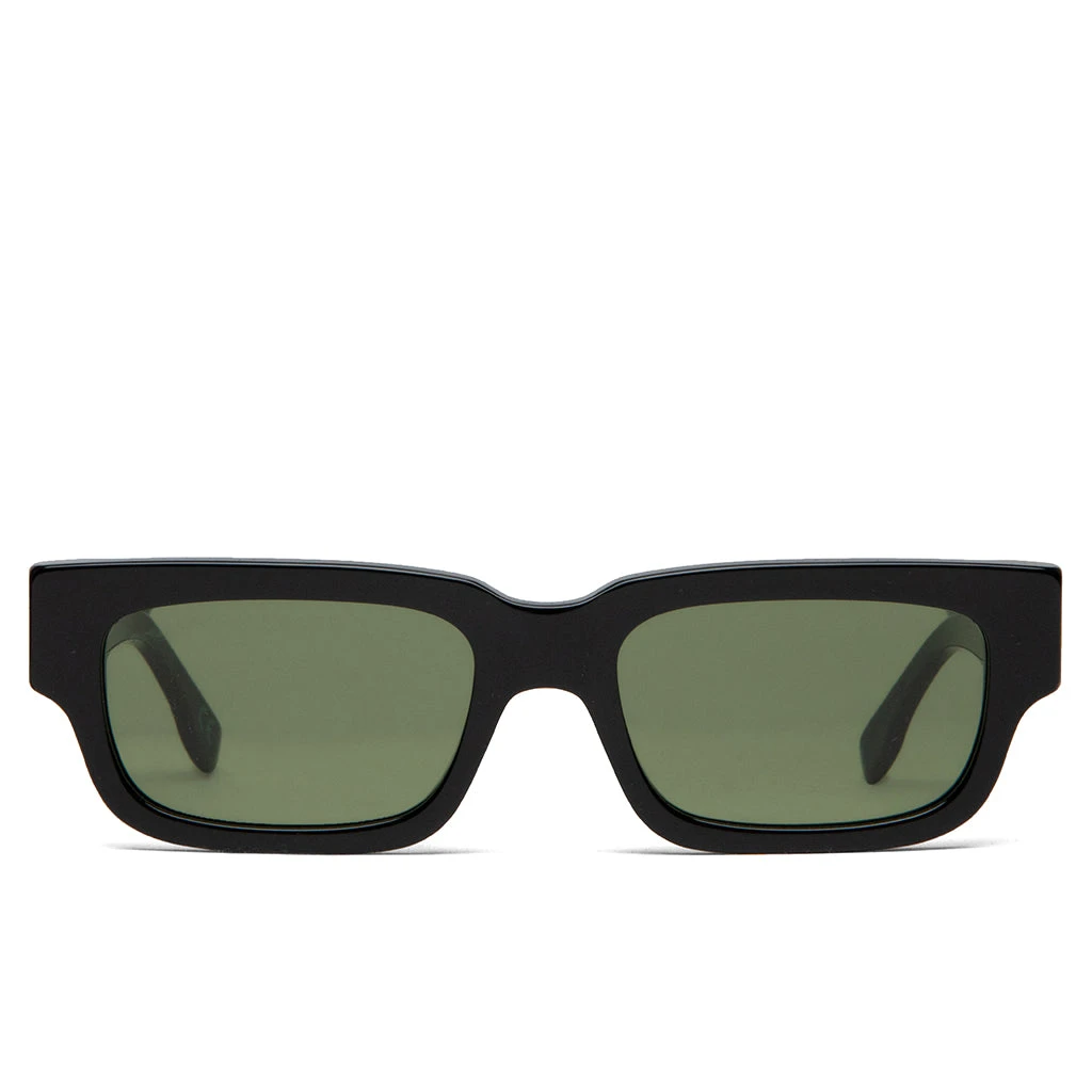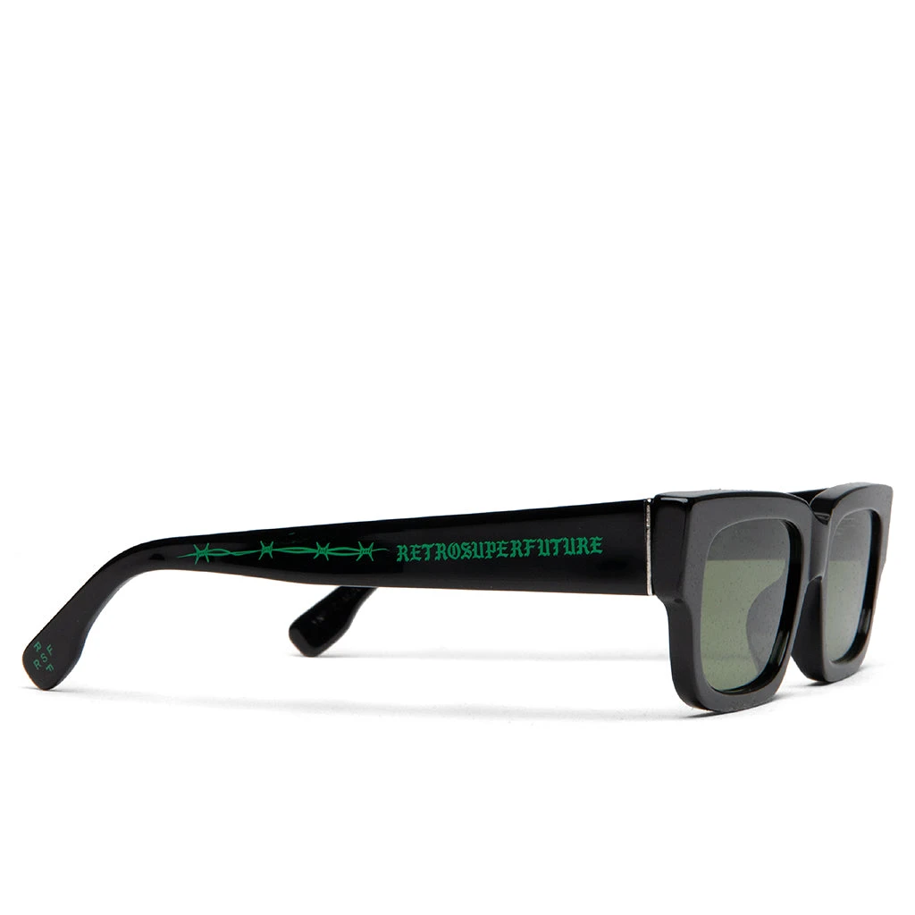 The contemporary styles of RetroSuperFuture are displayed within their latest collaboration with streetwear brand Born x Raised. The Roma is an all-black base with green lens’. The rectangular silhouette provides specialized branding within the outer temple piece.