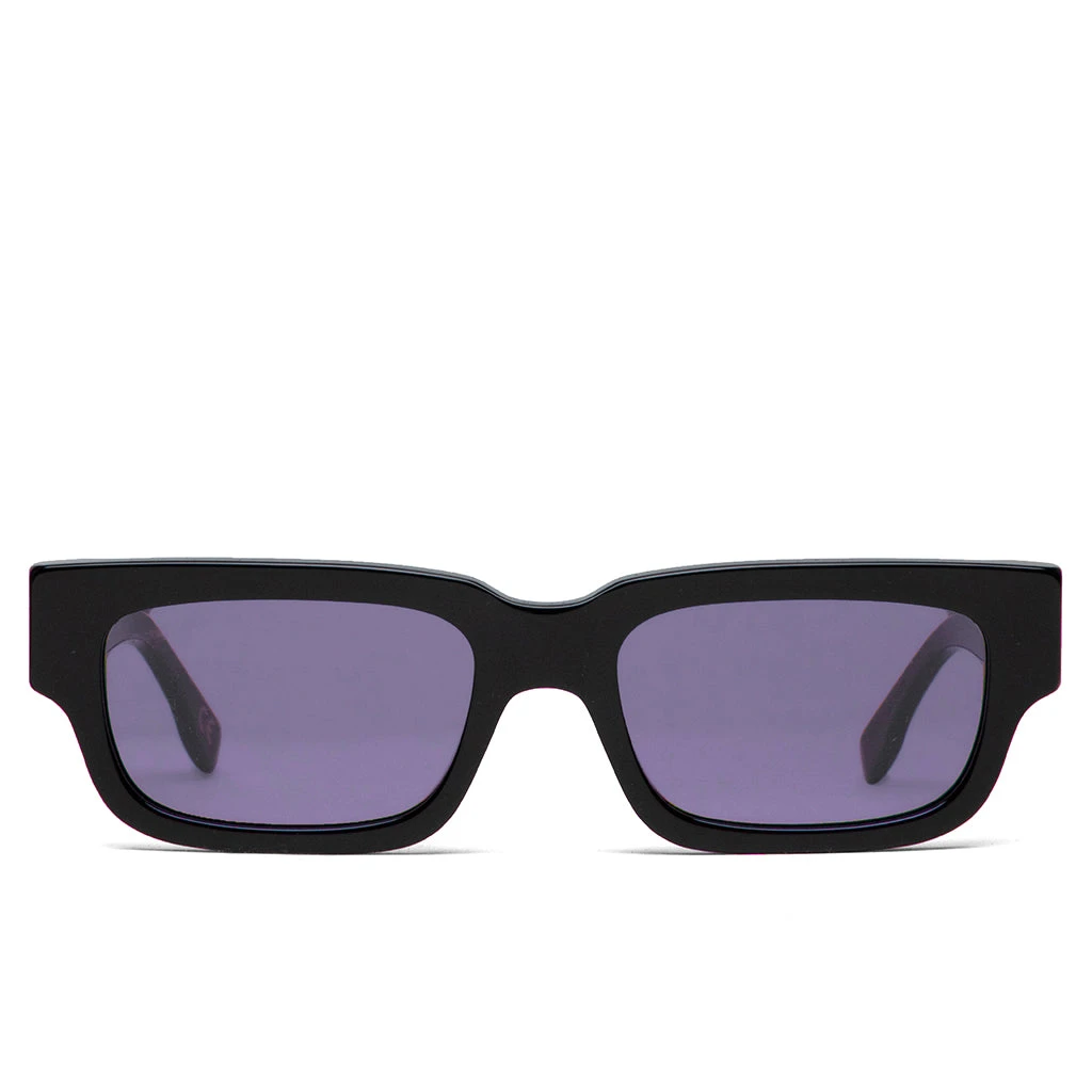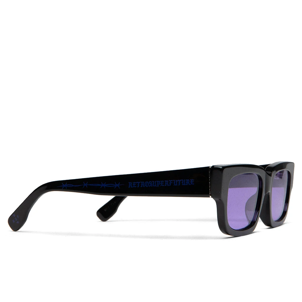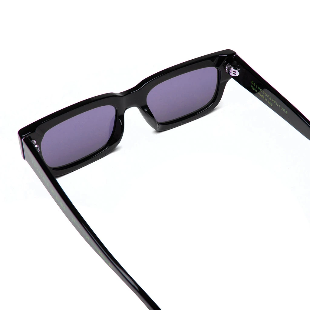 The contemporary styles of RetroSuperFuture are displayed within their latest collaboration with streetwear brand Born x Raised. The Roma is an all-black base with purple lens’. The rectangular silhouette provides specialized branding within the outer temple piece.