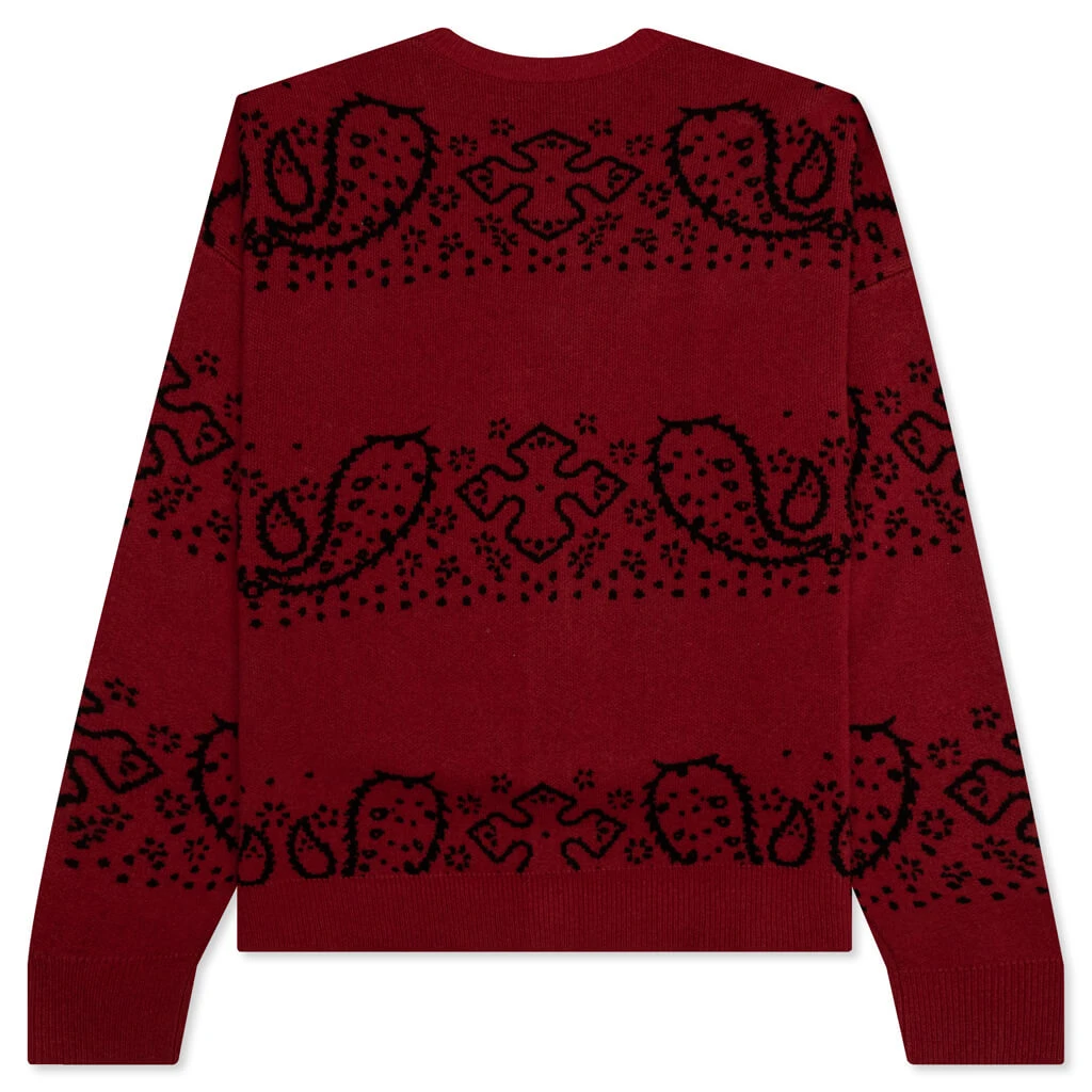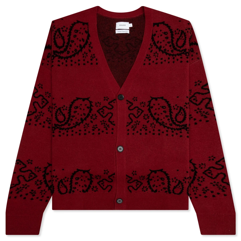 Rhude’s western inspiration makes an impression in the Bandana Knit Cardigan. Composed of a blend of wool and cashmere, the cardigan spotlights a hand-knitted aesthetic. A custom three-button closure is seen at the front, while the rib-knit trims offer added dimension. The all-over stitched bandana print completes the design.