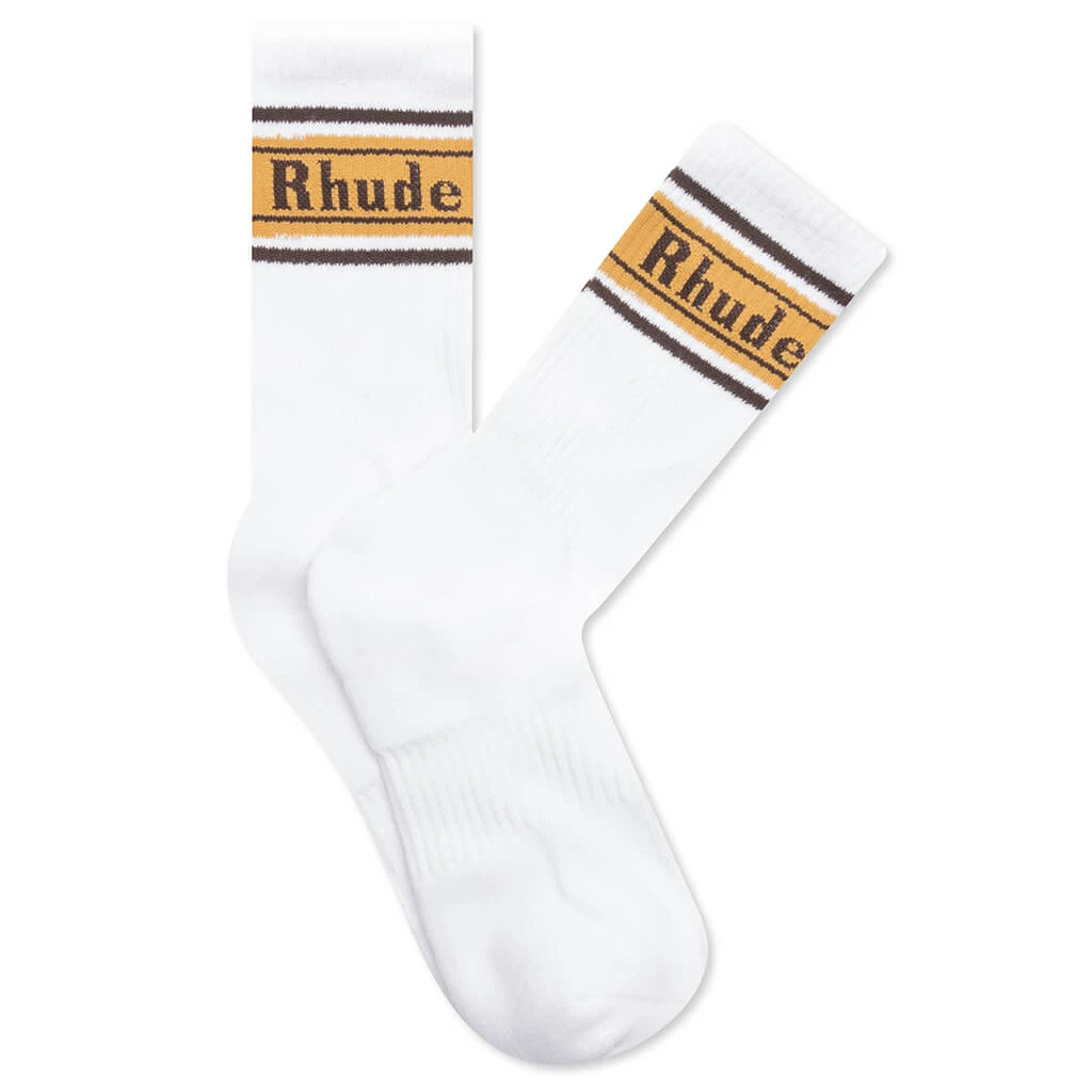 Add a premium accessory into your rotation with the Rhude Stripe Logo Sock. Composed of a blend of cotton, nylon, polyester, and spandex, the design features stitched branding at the ankle. The ribbed detailing finishes the look.