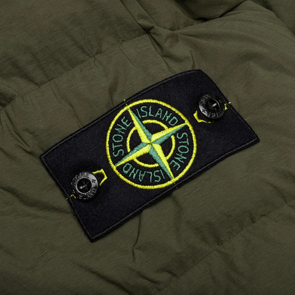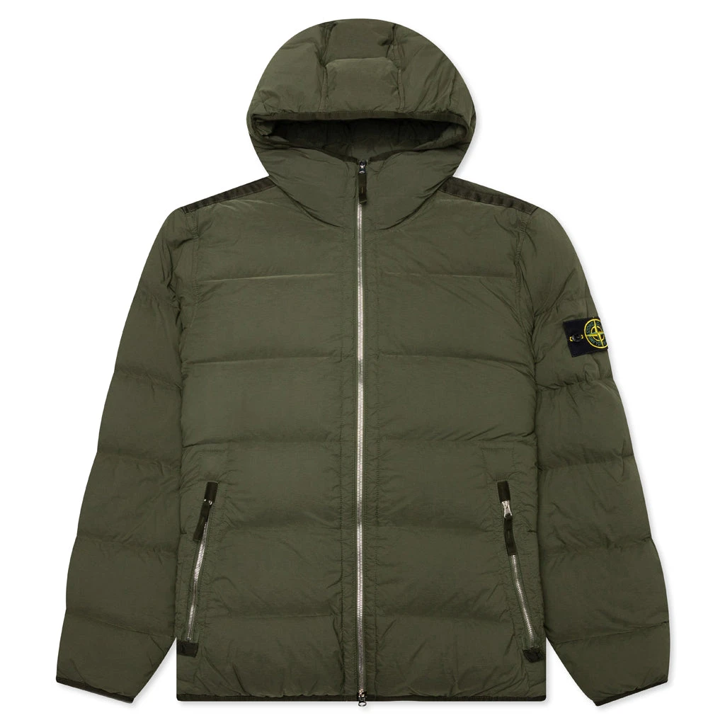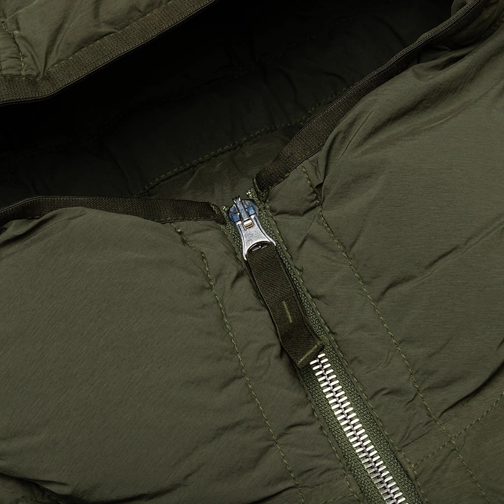 From Stone Island, the Real Feather Jacket is a down jacket with a sleek and seamless design and a regular fit. Crafted from a quilted lightweight stretch nylon and features a fixed hood.