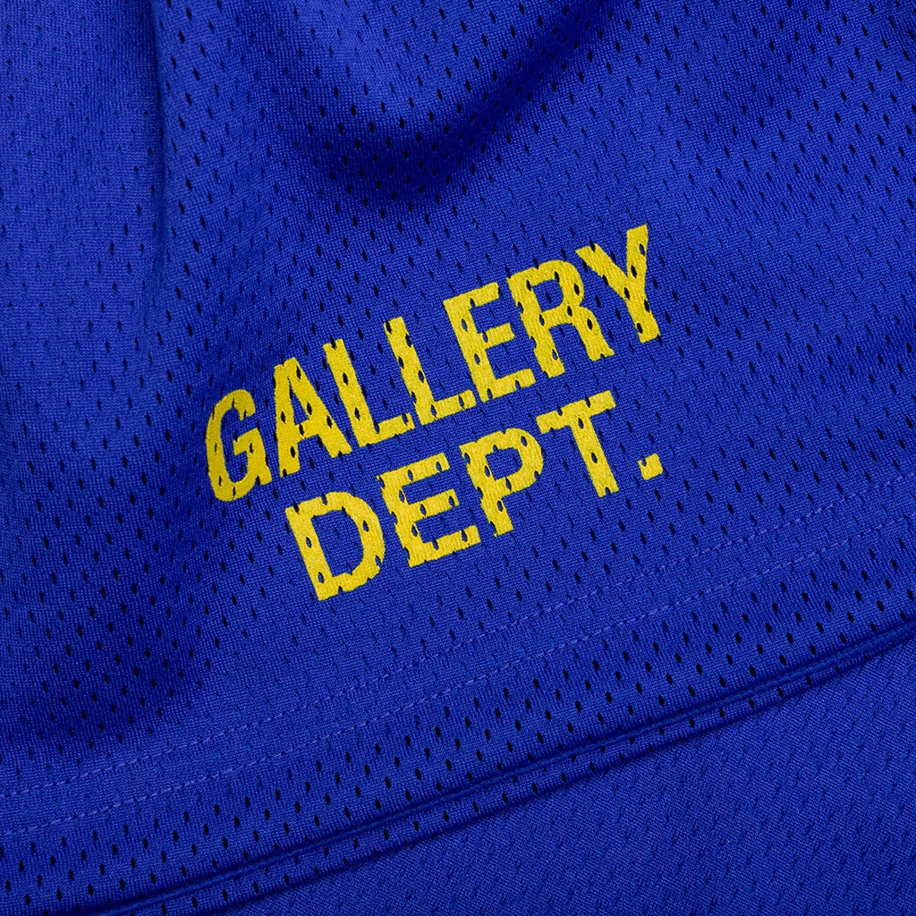 The Gallery Dept. Venice Court Shorts deliver a modern update to a classic athletic silhouette. Made from breathable mesh jersey, they feature a slightly shorter 8.25″ inseam for a contemporary fit. The balloon shape offers relaxed comfort, while the elastic waistband with inner drawstring ensures a secure feel. The shorts are finished with front slip pockets, white striped piping, and the GD ENGLISH logotype at the front. They are double-lined for added structure and durability. Made in the USA.